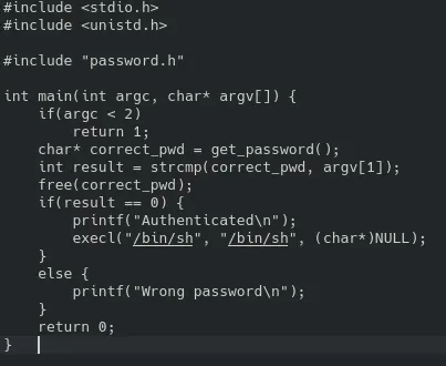 1) The vulnerability is that the restricted file 'password.h' is compiled into the final binary. The compiled binary does not read the file, it includes it, by examining the binary file we can try and find the password.