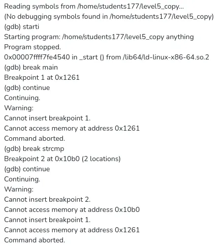 2) We started with exploring the file. We tried running it with no parameter, with a parameter 'AAAAAAA', and with 10.000 A's as a parameter to see if we find anything interesting. We ran 'strings level5', to see if we can find any strings, hoping the password would be stored in plain text. Unfortunately there was no text. GDB was not working at all, we couldn't make breakpoints, it would always make the breakpoint, and eventually when running/starting (run AAAA, start, starti) it would say the memory wasn't acceible, and breakpoint were not possible. Because the program couldn't pause, we couldn't make breakpoint, and we couldn't figure out why. We thought maybe because there are no 'debugging symbols'