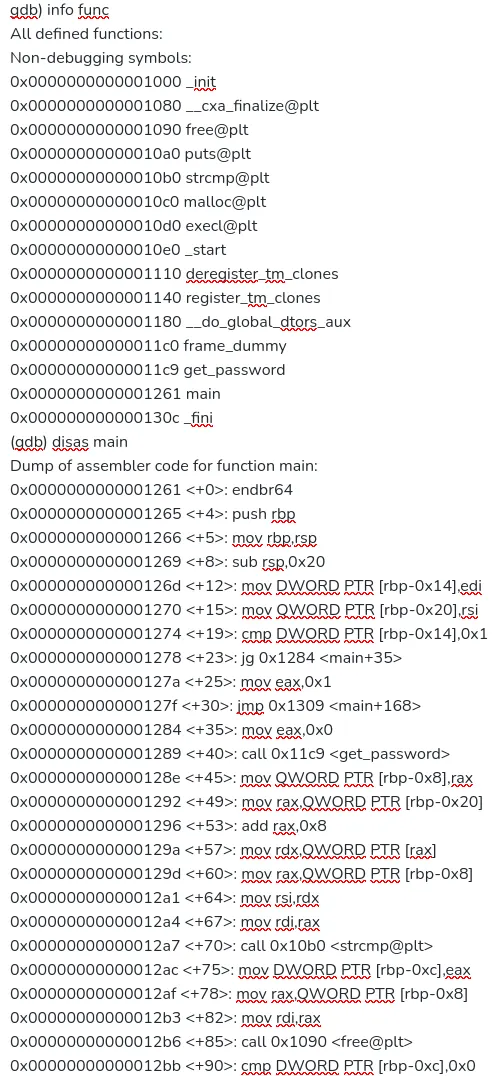 We would need to de-obfuscate the password. But looking at the assembly for the main function, we saw that the password word be right there, in the register RSI or RDI. We tried many things, but GDB didn't work and not using GBD would mean that ASLR would be on.