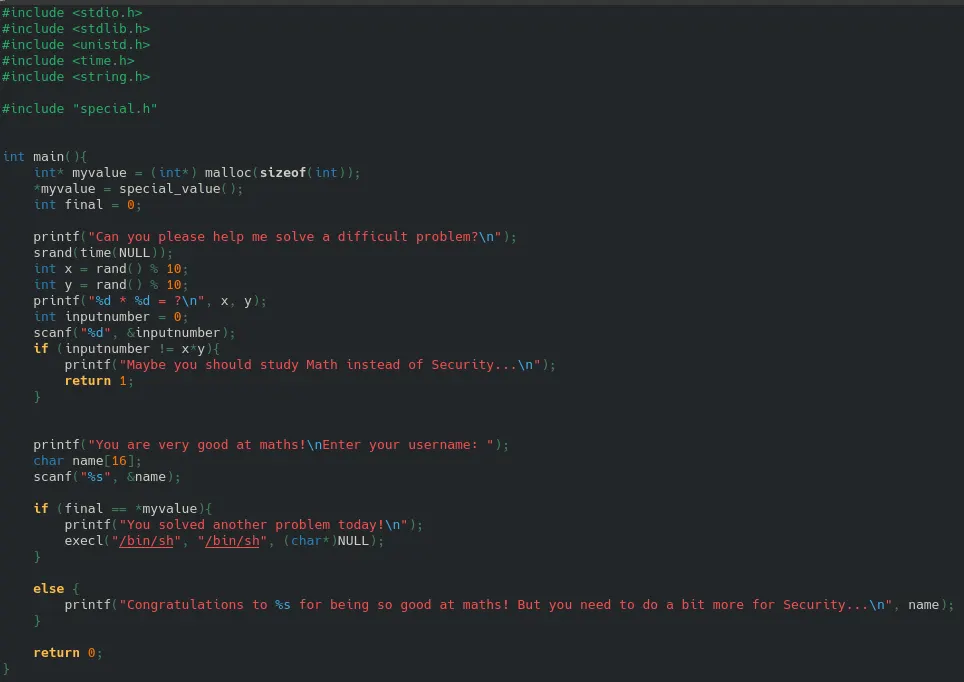 Similar to level5, there's a hidden special.h file, containing a function that generates a value. The vulnerability is that the binary contains this file so we can likely find the password. Either - it's a raw hardcoded string/number always the same (we can find using strings ./level7 and/or look at assem.), or it's a generated/obfuscated one like in level5, then we need to use GDB again, make appropriate breakpoints and read the value from the register it should be in at that breakpoint.