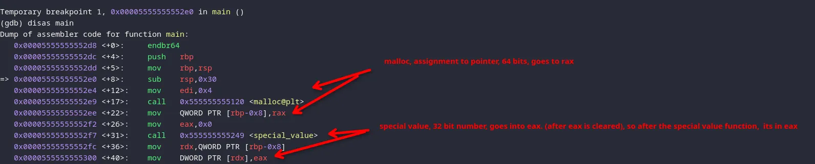 (gdb) break *0x0000555555555425 Breakpoint 3 at 0x555555555425 (gdb) run Breakpoint 2, 0x0000555555555251 in special_value () (gdb) c Continuing. Can you please help me solve a difficult problem? 9 * 5 = ? 45 You are very good at maths!