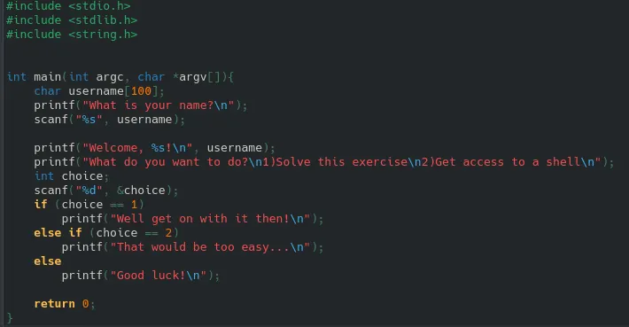 2) There's no /bin/sh or /bin/bash in the code itself, we must inject shellcode via the scanf into the username buffer. Maybe use NOP sleds if it turns out to be difficult to determine the correct offsets.
