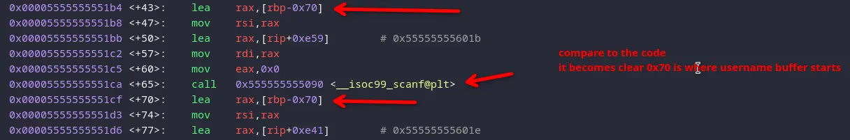 Let's find the actual mem addr where username starts by breaking after scanf and printing: